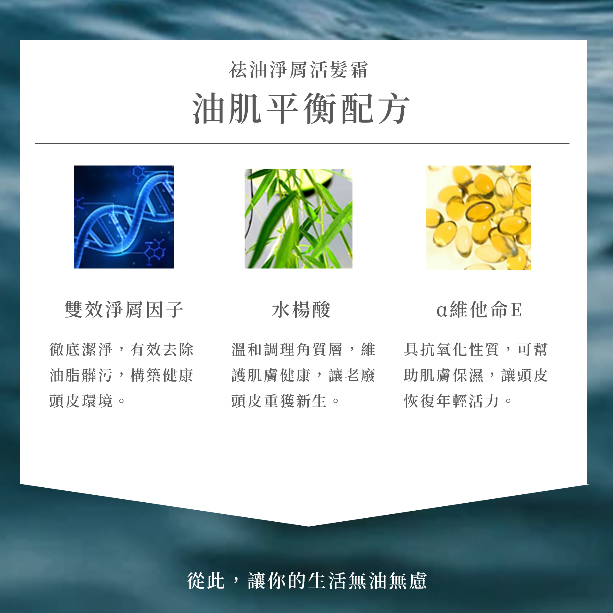 * 建議搭配其他祛油淨屑產品使用,極淨控油清爽,全方位解決頭皮過度出油與皮屑增生困擾,有效平衡頭皮狀態,擺脫惱人油臭味。