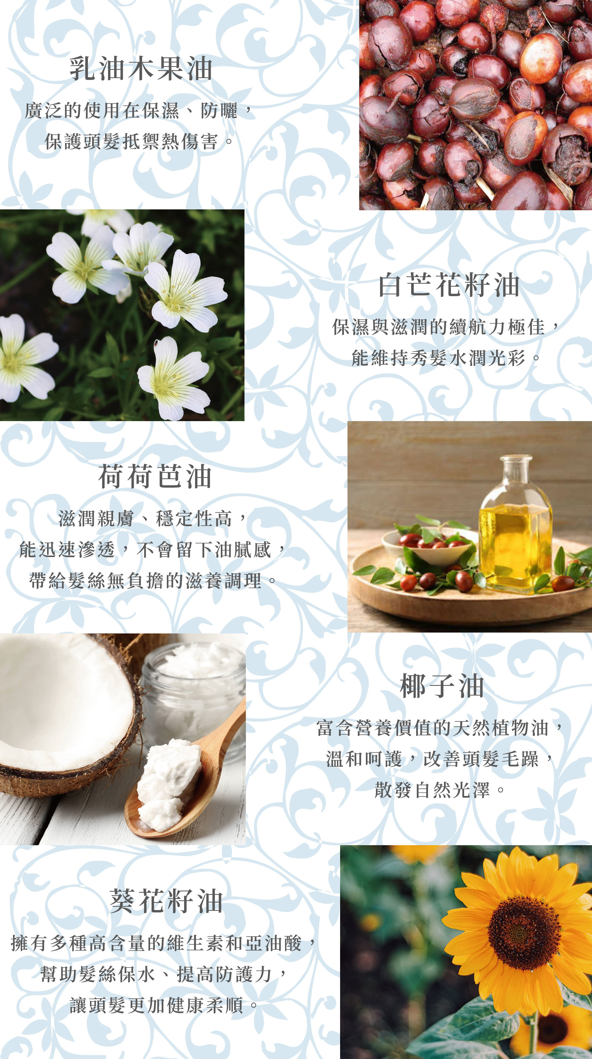 ◎ 特別添加竹崎早生酪梨油,富含維生素,深層滋潤修護、防止髮絲分岔,讓頭髮回到最初的健康亮麗
