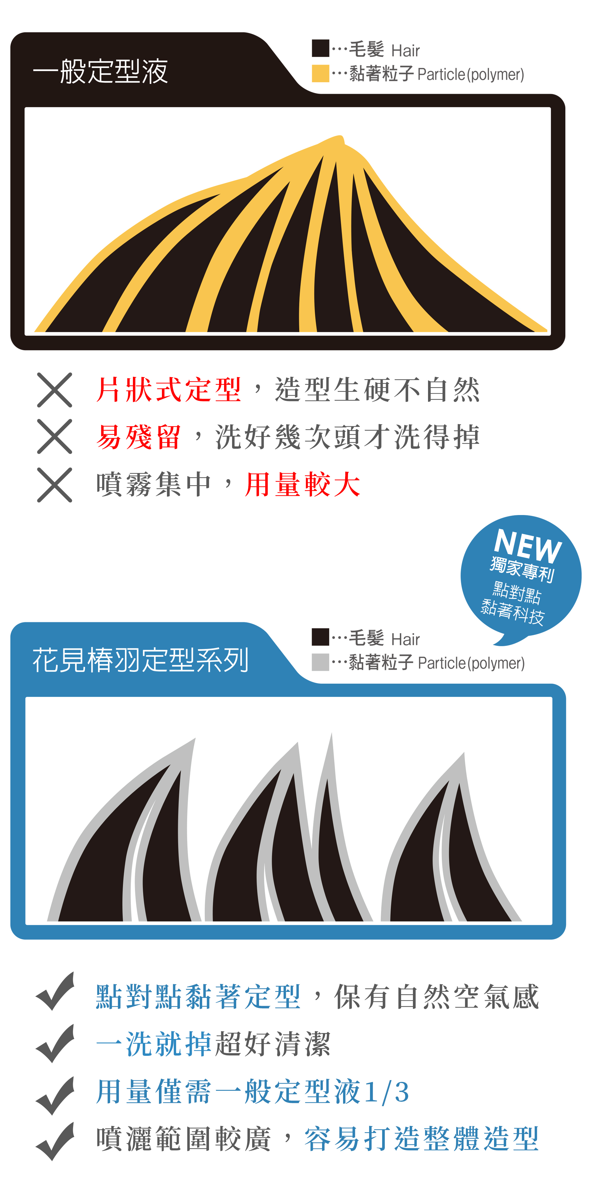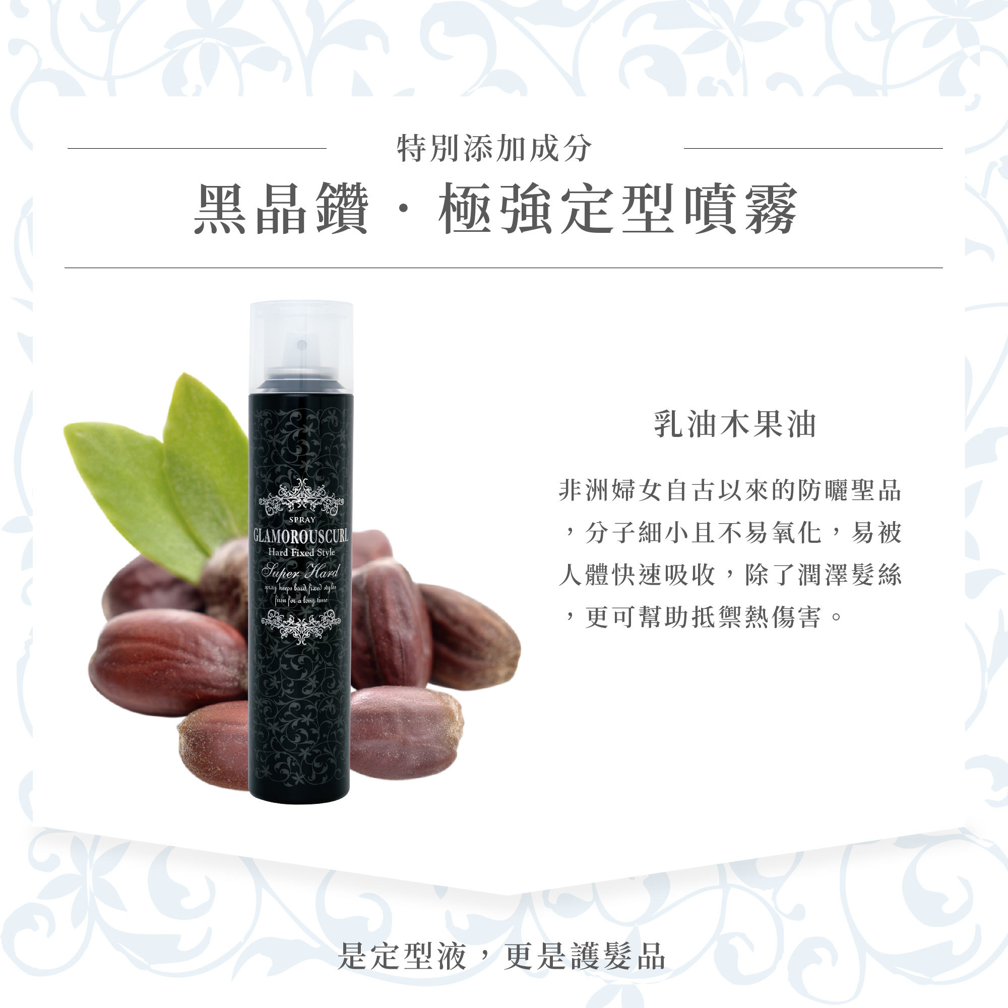 ◎中野製藥獨家定型專利科技,推翻傳統定型液技術,不會黏成僵硬髮片,長時間維持造型,並添加乳油木果油,極細滋潤分子能深入頭髮內層,定型同時修護髮絲。