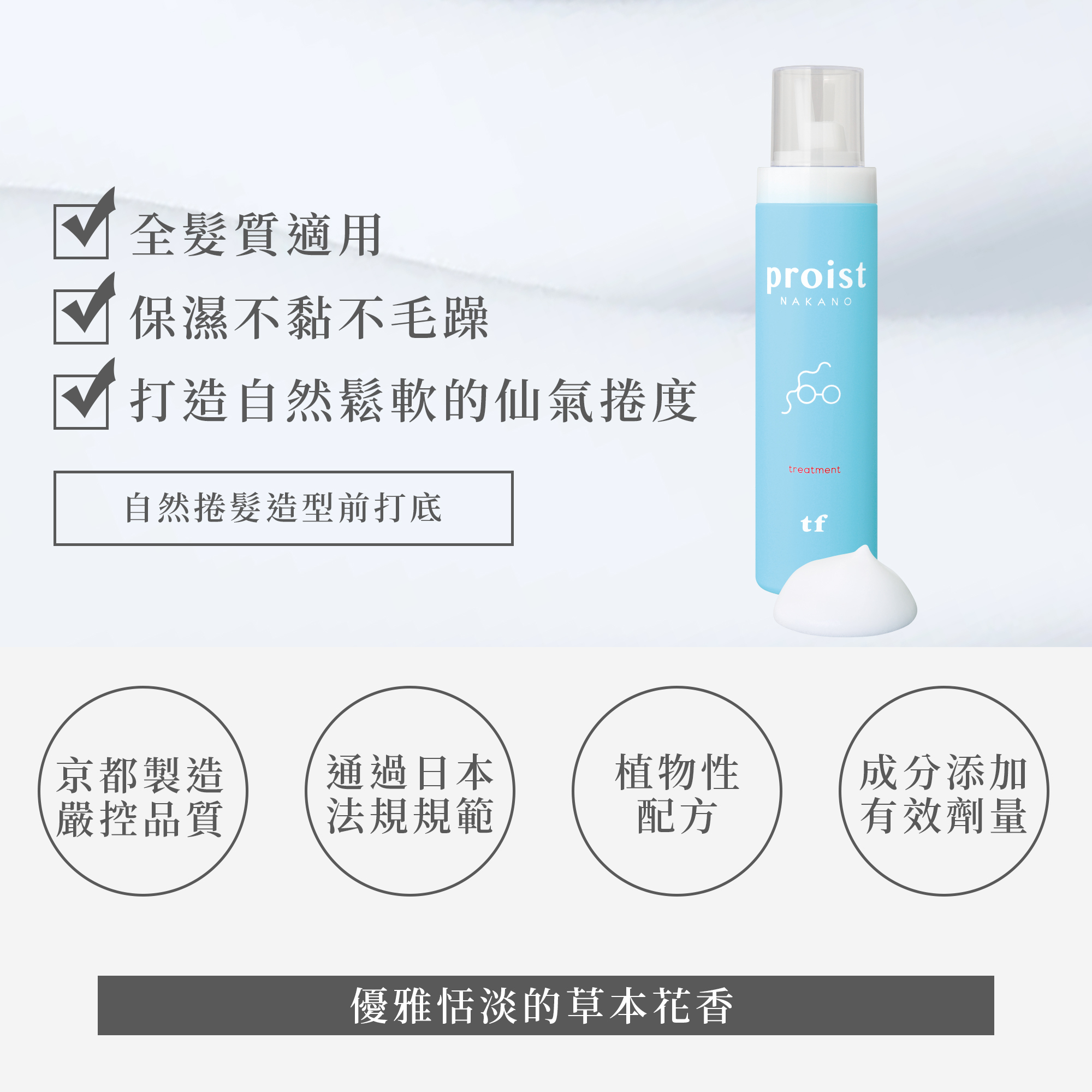 proist沁透柔捲慕絲tf全髮質適用,特別萃取荷荷芭油、乳油木果油以及水解角蛋白,深入內部強健髮芯,打底塑型,並在頭髮表面形成防護膜,抵禦日常的環境壓力,一整天滑順捲翹。